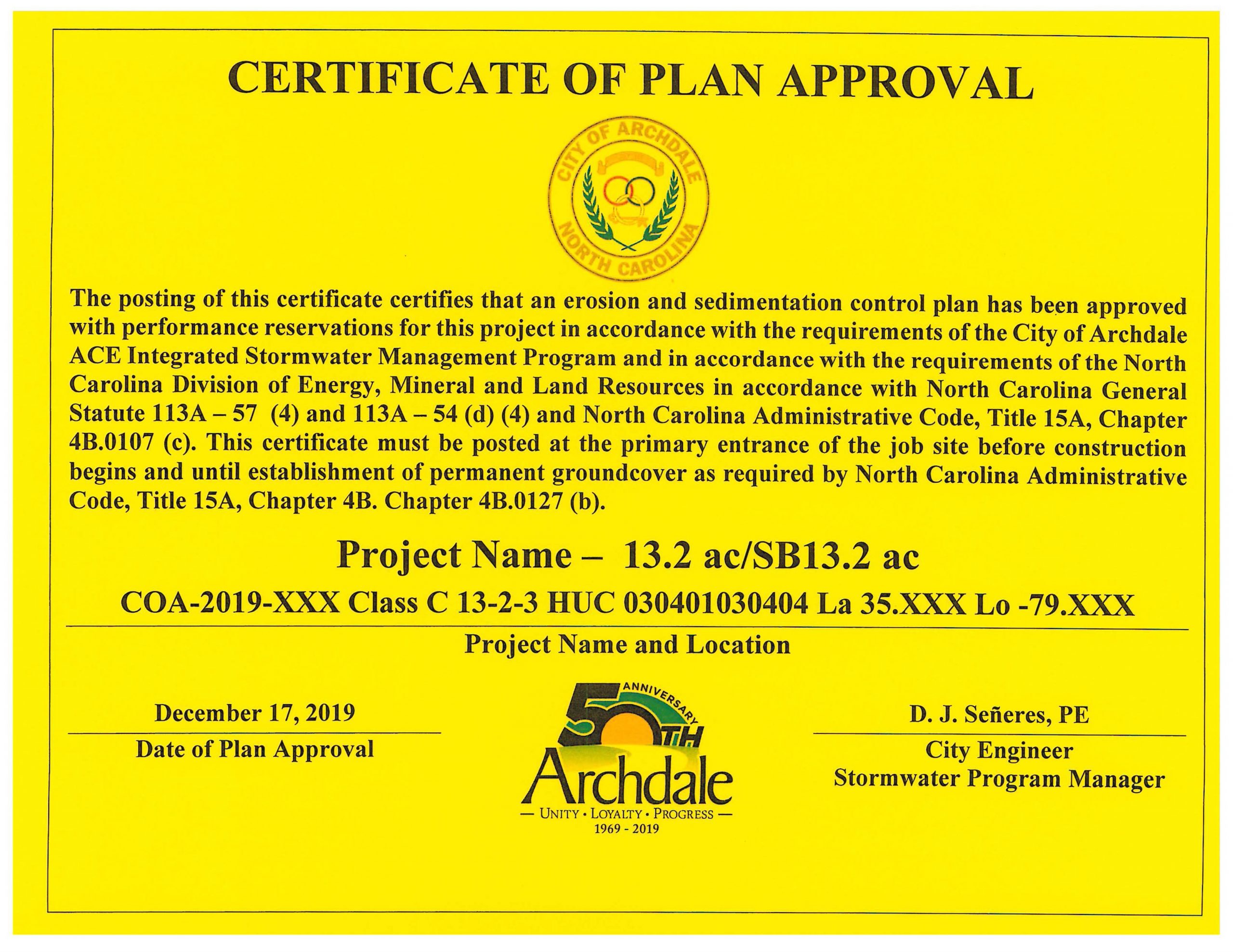 In addition the Compliance Audit Team required the removal of the "NCDENR" logo on the Certificate of Approval with Performance Reservations issued for all sites over 10,000 square feet. This is the first time the for the document has been changed in the City of Archdale.